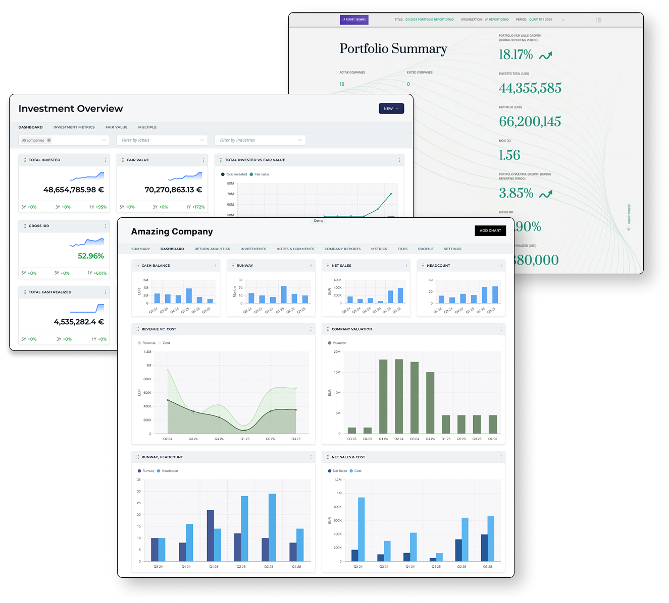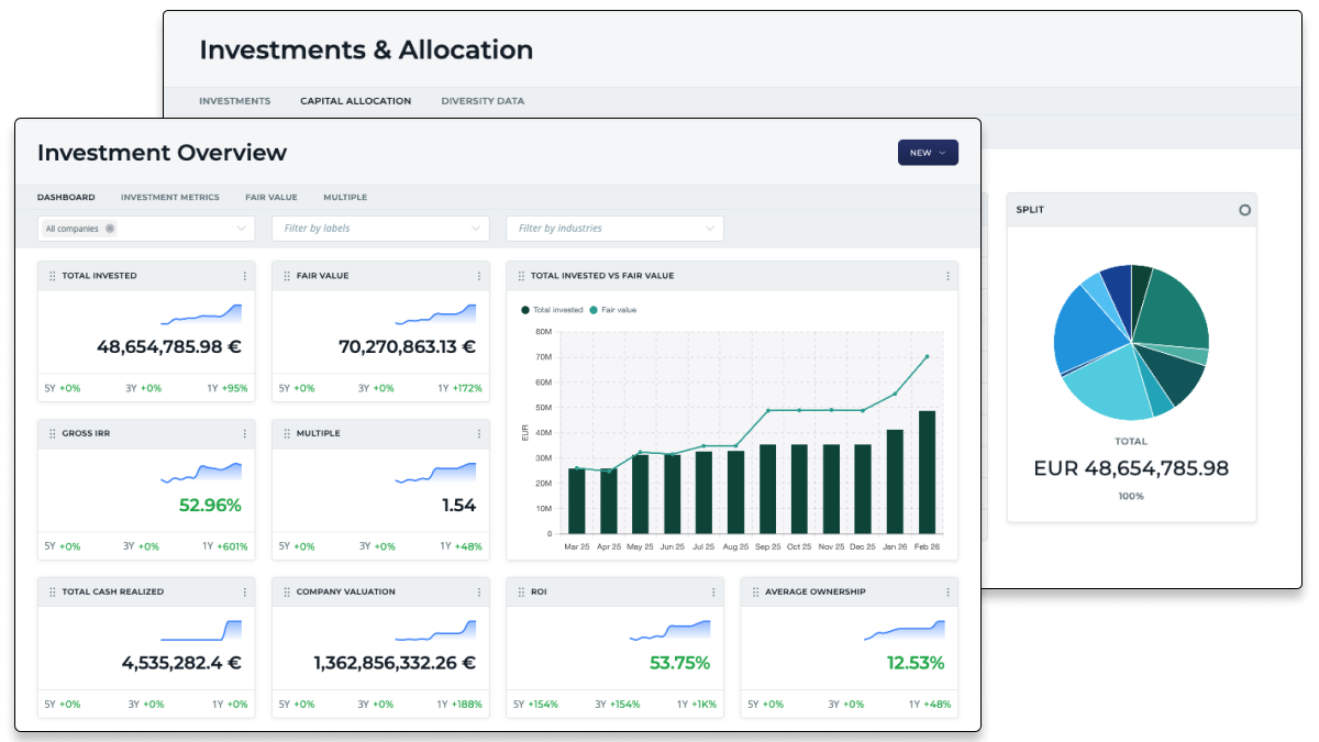 No more chasing spreadsheets – track portfolio performance with automated data flow via Google integration, Excel import, and AI-powered data collection. Get instant calculations for IRR, Multiple, and other key metrics at company or fund level.